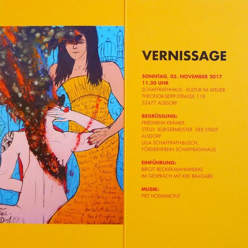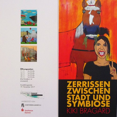 Die Künstlerin Kiki Bragard lädt ein zur großen Ausstellung im Schaffrath Haus, Theodor-Seipp-Straße 118, Alsdorf. Sie stellt Werke ihrer "You" - "Intermezzo" - und Städte-Serien aus. Die Ausstellung „Zerrissen zwischen Stadt und Symbiose“ ist ihre erste Soloausstellung in der Region seit dem Jahr 2003. Hier stellt sie erstmals ihre komplette You-Serie aus. Daneben findet auch ihre Intermezzo Serie ihren Platz in der Ausstellung.
