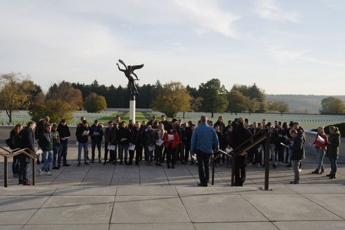 Zunächst führte die Exkursion nach Belgien, genauer gesagt zum 1944 errichteten amerikanischen Soldatenfriedhof in Henri-Chapelle. Dort trafen die Schülerinnen und Schüler zum einen Dr. Benjamin Becker, Direktor des Amerika-Hauses, der den Ausflug begleitete, und zum anderen Christopher Arseneault. Der Amerikaner ist Superintendant bei der „American Battle Monuments Commission": „Ihr lebt in einer Region mit viel Geschichte. In Hürtgenwald fand 1944/45 eine große Feldschlacht zwischen der US Army und deutschen Truppen statt. Allein dieser Kampf forderte tausende Menschenleben auf beiden Seiten. 8.000 Amerikaner fielen und fanden ihre letzte Ruhe auf dem Soldatenfriedhof in Belgien. „Hier seht ihr 8.000 weiße Steinkreuze, eins für jeden Gefallenen. Außerdem ruhen hier 94 Soldaten, die nicht identifiziert werden konnten." Anschließend durften die Besucher die Gräberreihen der Gedenkstätte erkunden. Becker hatte im Vorfeld Steckbriefe mit kurzen Biografien einzelner Gefallener verteilt, sodass sie sich mit deren Schicksalen befassen konnten und die Namen und Todesdaten auf den Kreuzen ein Gesicht bekamen.