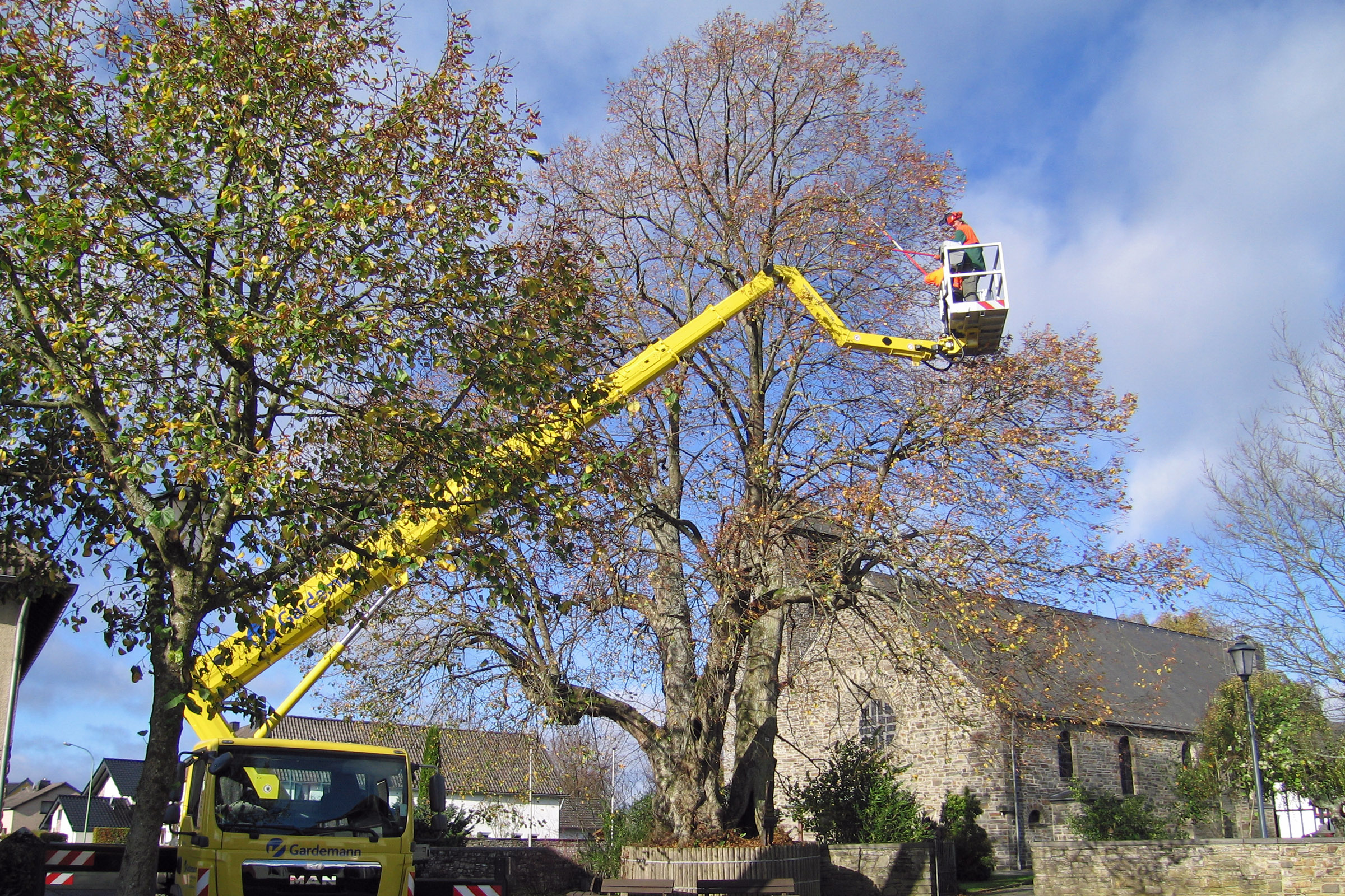 Mit Unterstützung von Mitarbeitern der Wabe e.V. und einer LKW-Arbeitsbühne geht es hoch in die Baumkronen, um einen Gesamtüberblick zu erhalten. Abgestorbene Äste oder Windbruch werden dabei sofort beseitigt. Der Austausch oder Einbau von Kronensicherungen mit Seilsystemen oder eine umfangreichere Kronenpflege erledigen später Fachfirmen.