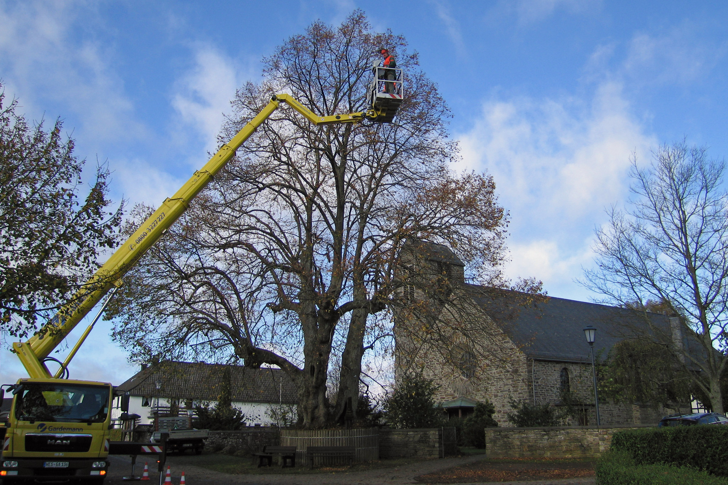 Schätzungsweise 400 Jahre alt, ortsbildprägend und auch offiziell ein „Naturdenkmal“: Die alte Sommerlinde („Ar Lengd“) vor der Kirche in Simmerath-Eicherscheid wurde jetzt ebenso wie rund 250 weitere Objekte kontrolliert. Auf der Arbeitsbühne Udo Thorwesen von der StädteRegion und Alex Riffel von der Wabe.