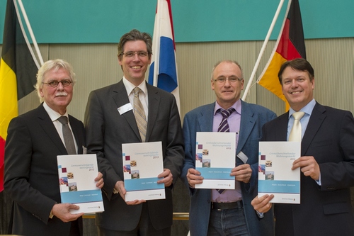 (v.l.n.r) den Vaalser Bürgermeister Reg van Loo, Oberbürgermeister Marcel Philipp, Kabinettschef Alfred Velz von der Deutschsprachigen Gemeinschaft in Belgien sowie den niederländischen Regionalminister Erik Koppe.