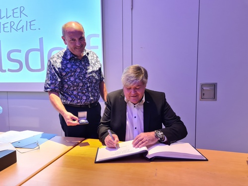 Platz für weitere Firmenansiedlungen ist knapp geworden im Business Park Schaufenberg. „Wir haben es im Laufe des Strukturwandels geschafft, sehr viele Unternehmen hier bei uns anzusiedeln und eine echte Erfolgsstory schreiben zu können", sagt Bürgermeister Alfred Sonders mit Blick auf die hohe Auslastung. Für die Huendgen GmbH, die vom Standort in Würselen nach Alsdorf übersiedelt, konnte noch eine Fläche gefunden werden. An der Thomas-Dachser-Straße wachsen die Büroräume und die moderne Fertigungshalle. Vor Ort hat sich der Bürgermeister gemeinsam mit Marc Knisch von Firmenchef Philipp Hündgen-Ervens, dessen Vater Josef Hündgen und Prokurist Ludwig Ervens den Bau vorstellen lassen.