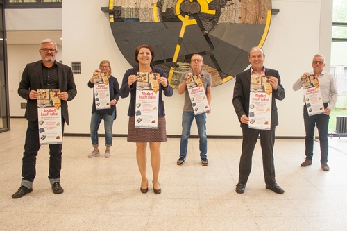 Plakate sollen im Stadtgebiet auf „Alsdorf kauft lokal" hinweisen. Die Macher und Sponsoren, die hinter der Idee der Internet-Plattform stecken: Markus Bienwald (EWV, vorne v.l.), Bürgermeister Alfred Sonders, Sonja Alagic (Geschäftsstellenleiterin Sparkasse Aachen in Alsdorf), Stefan Heffels (ASA, hinten v.r.), Holger Bubel (ASA-Geswchäftsführer), Birgit Becker-Mannheims (Alspresso Verlag)